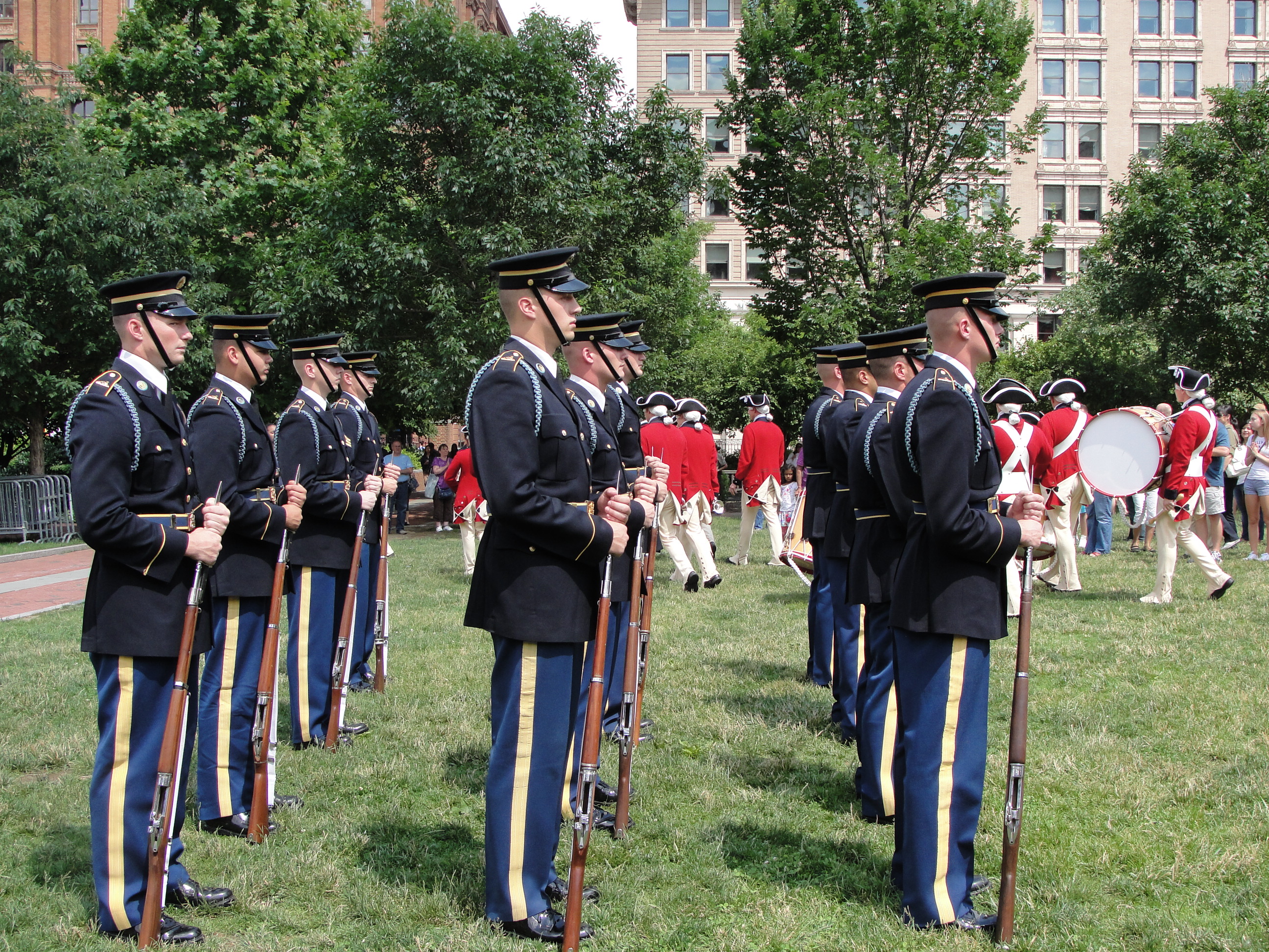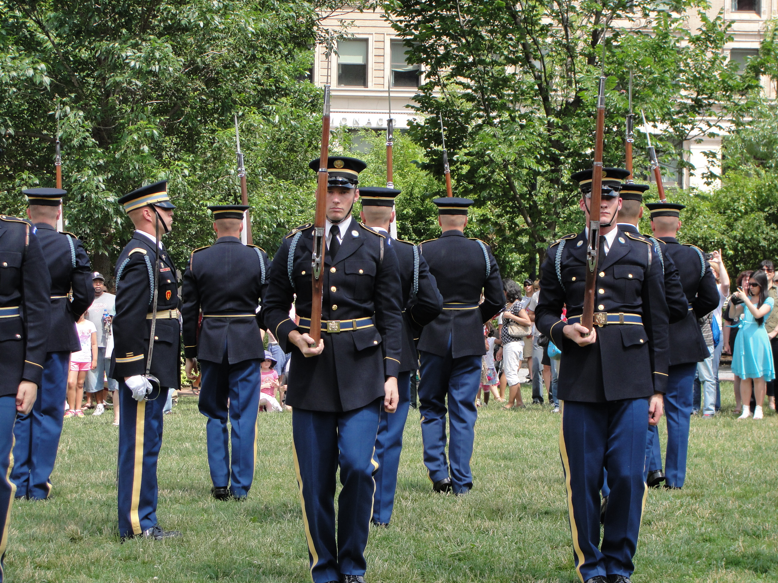离开“立法院”,我们来到“自由广场”。广场很大,呈正四方形。进大门,三面都是宫殿式建筑。大门对过,是中正纪念堂。纪念堂有七八层楼高,纪念大厅在六层,很宽大、气派。蒋中正坐像居中,两侧有士兵站岗。我们是下午四点钟到达,刚好是士兵换岗的时间。换岗仪式持续20分种,有一套很复杂的程序。北京的毛泽东纪念堂,就规模讲,比不上中正纪念堂。