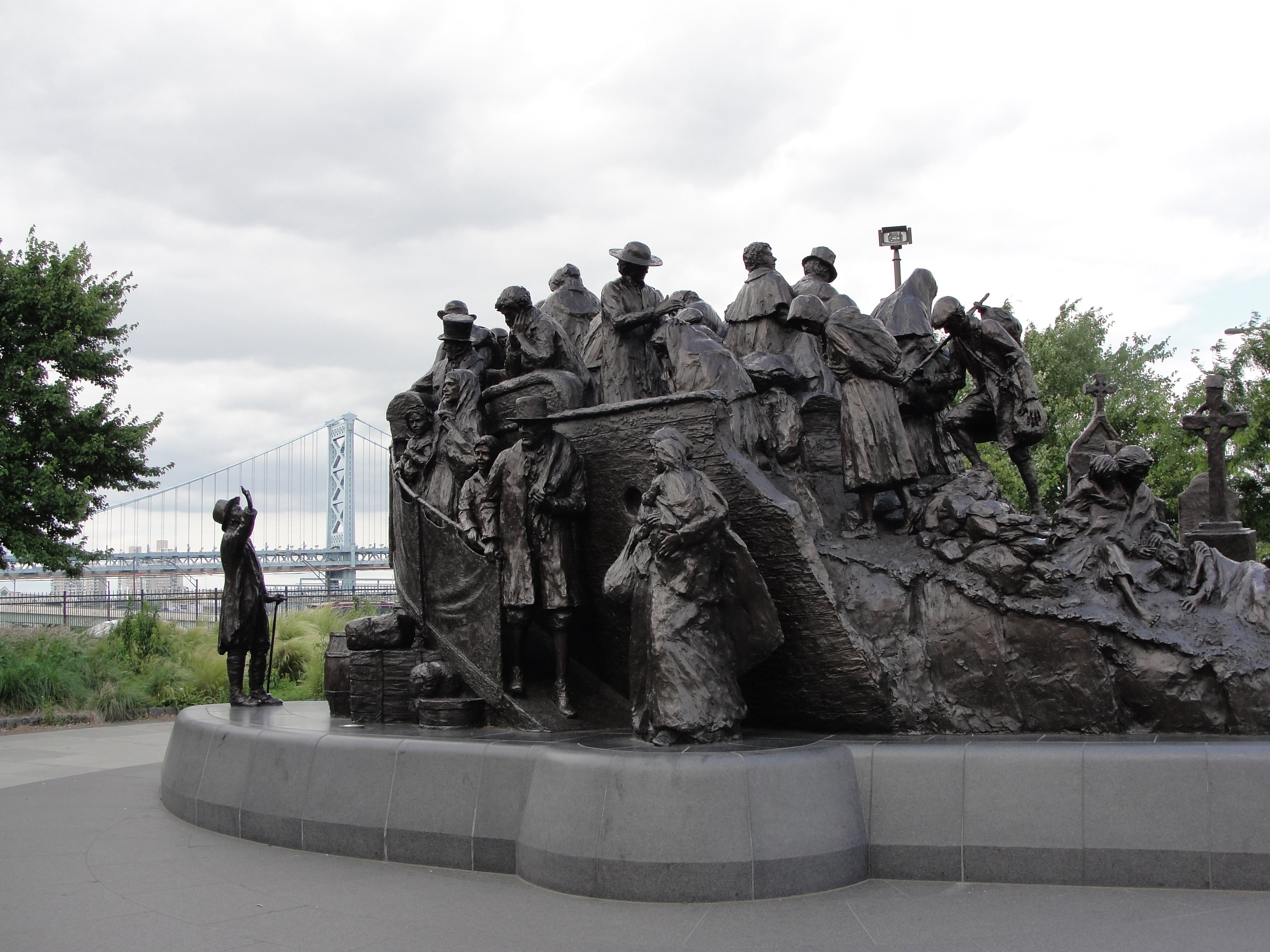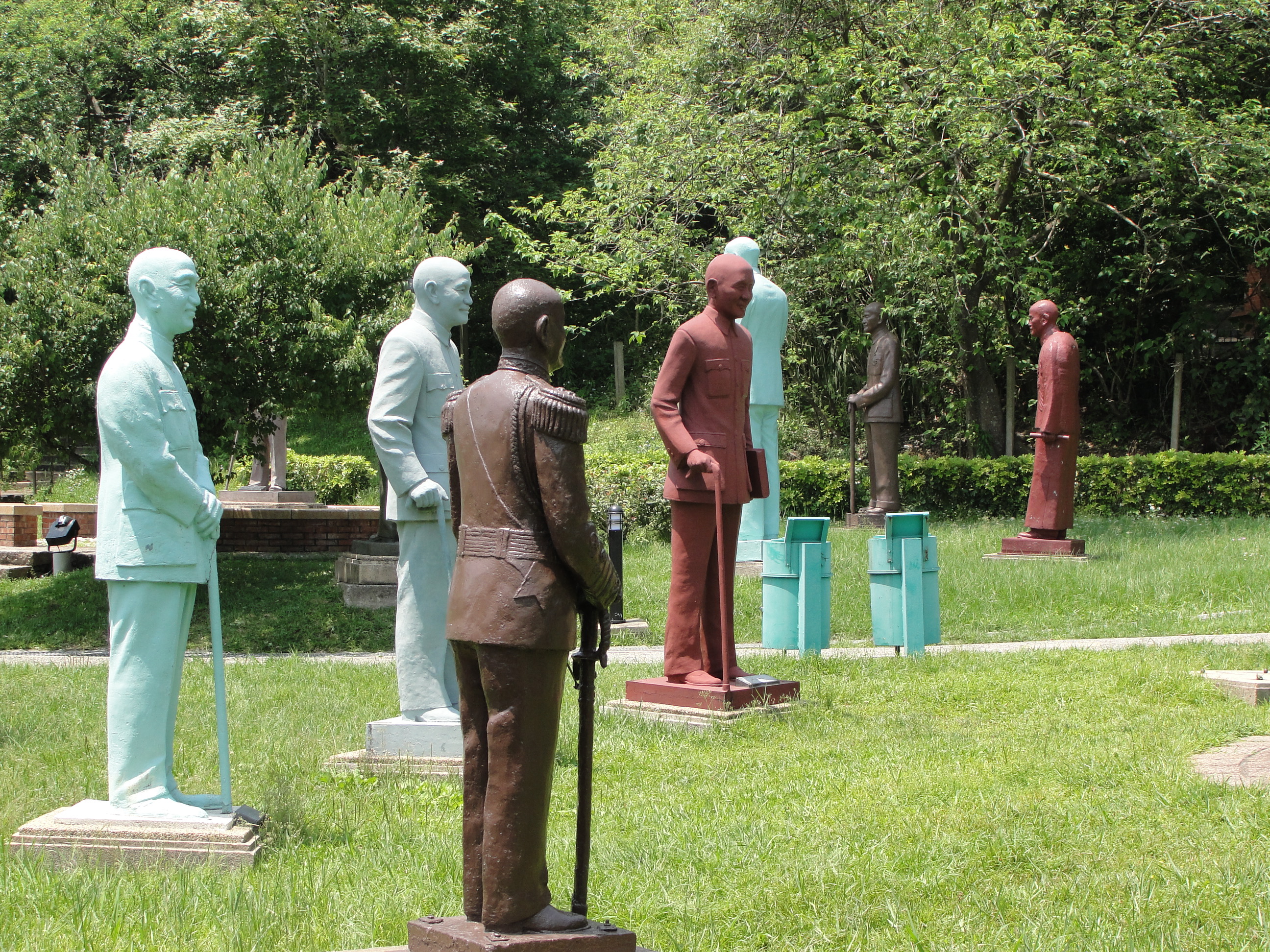 陵园有一奇特的“景观”。在入口处右侧有一片不高的小山坡,山坡上摆满了蒋介石的塑像,足有二三百座之多。有立像,坐像,有文像,也有武像,都有一人高,这些雕像围成五、六个小圈子,像在开会似的。河边抚拦杆上,也摆满小形的半身塑像,每座塑像下面都写有原存放地,如XX国中,XX国小等。这是怎么回事呢?原来是陈水扁执政时搞“去蒋化”,到处砸烂蒋介石塑像。国民党便把全台湾的蒋介石塑像集中运来,摆放在陵园里,以免被打烂。