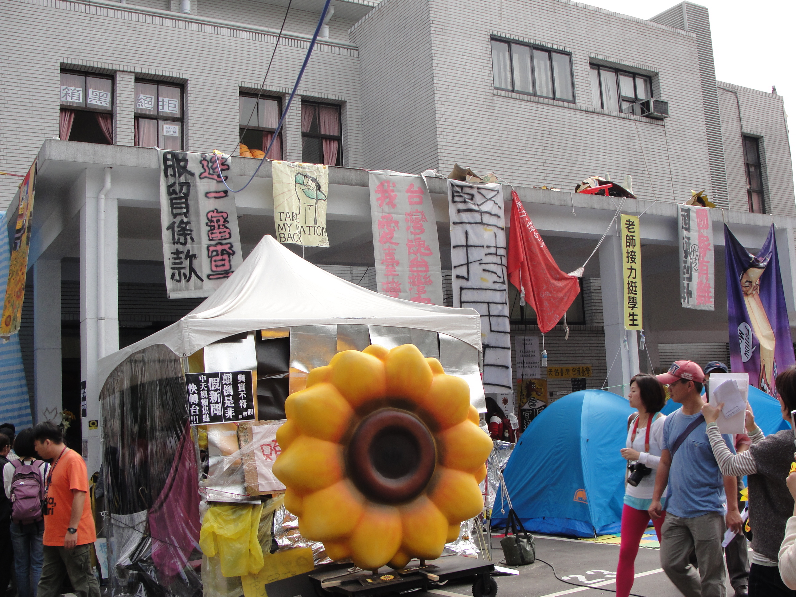 今天是台湾“太阳花学运”最后一天,明天学生就要收摊回校。大家想去看看。车停在台大儿童医院地下车库。步行穿过一条马路就是台湾“立法院”。立法院四周街道(都是小街),全被学生占领。学生在人行道上打地铺,到处贴满“反服贸,救台湾”等标语,“台独”旗帜也出现在街头。有一个辩论会正在进行,你问我答,煞有介事。立法院门口。已被警察占领,无法进入。我们随便走走,拍些照片,学生也不干预。其乱象。有点类似文革初期。