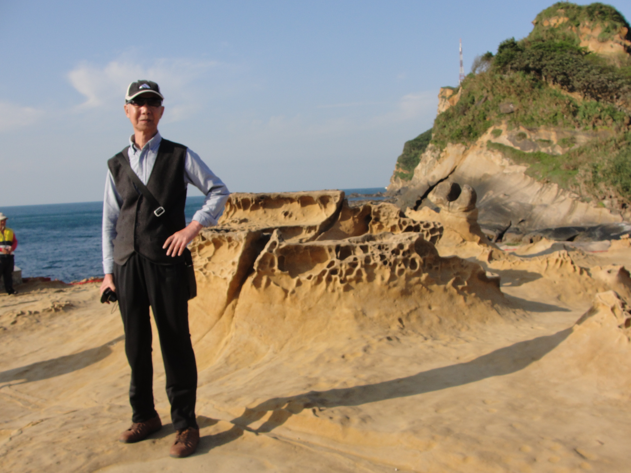 午饭后,驱车向东沿着海边行驶约一小时,在快到基隆市区的一处美丽的海滩 ,——野柳“国家”地质公司到了。海滩 上有岩石并不奇怪,这里岩石与众不同,呈奇形怪状。这是地壳远动的结果。标志性的一块岩石叫“女皇头”,与邮票上的英女皇头像十分相似。可惜我没拍好,只拍得一张“公主头”。游人依然很多,都对此地景观赞叹称奇。到台湾观光,此处不可不去。