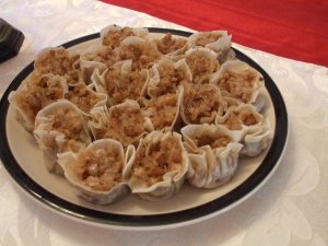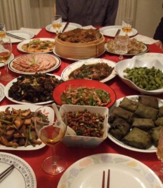 这几年国内西风东渐,过洋节日的风气在国内越来越浓,据说平安夜大餐和圣诞节Party成为各商家促销的良机,平安之夜演变成了狂欢之夜。可是在美国的绝大多数中小城市里(旅游城市例外),传统风俗几百年一成不变,在平安夜和圣诞日里各商家关门歇业,老百姓们大都待在家里享受着全家团聚共进大餐的快乐团圆的日子。在美的老中们身边没有7大姑8大姨的,遇到这些团圆的节日多为几家朋友聚在一起开个Party, 一般轮流做东,东家多准备一些,来的朋友再带一两个菜或甜食。今年的圣诞Party 在我家举办,一共3家9个人,过着洋节日,吃着中国菜,欢欢喜喜的在他乡把节日过得也很不错。这次晚宴上有一个餐前点心,4个冷盘,7个热炒,一个汤,2个餐后甜点。饮料是德国产冰酒,苹果汁,雪碧,可乐等。