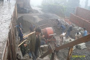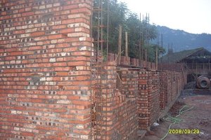 10月中旬班主收到信天先生发来的小学施工进度汇报,并在论坛上向网友们通报:“今天收到信天发来的新照片,我们的小学墙已经起来啦。大概有一两米的样子吧。真兴奋!由于当地煤炭供应紧缺,基建项目又比较多,砖厂的砖刚刚一出炉就被抢购一空。一次只能买1000块。这令工程的进度受到影响。还是看照片吧:”