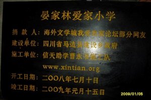 9月9日,《文学城.我爱我家〉论坛与国内代理人信天先生签订了“晏家林爱家小学 资助建校授权委托书”,9月11日,代理人又与建造单位,施工单位,监管单位等签订了“晏家林爱家小学资助建校协议书”,至此我们从5月四川大地震后就开始筹备的为国内贫困小学献爱心的活动到了具体施工阶段,我们的捐款活动暂告一个段落。