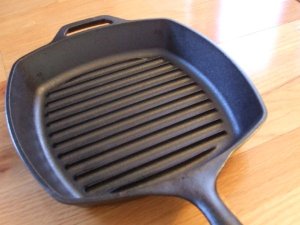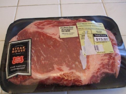 有人说在经济低迷时期要大力发扬山寨文化,为了配合这一潮流,更重要的是要少花钱多办事办好事,阎家厨房开始了新的尝试—自烤牛排。说干就干,慢着,磨刀不误砍柴工,首先得把利器备好,从wal-mart 扛回死沉死沉的铸铁(cast iron)平底锅一口,然后精心选择了适合作牛排的肋眼(rib eye)牛肉一块,大约22 oz。