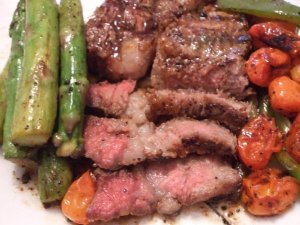 将牛肉一切为二,表面用橄榄油抹一下儿,然后撒上海盐,黑胡椒粉腌制1小时。将铸铁锅烧得很热,放入牛排,如果要5分熟,一面煎4分钟,然后翻面煎另一面,4分钟,关火,用锅中的余热再烤6-7分钟,预热装牛排的盘子,出锅上盘。最后利用锅里煎出的油汁放入芦笋,小番茄或洋葱等煎个几分钟,衬在牛排边上,一盘山寨牛排就大功告成了。