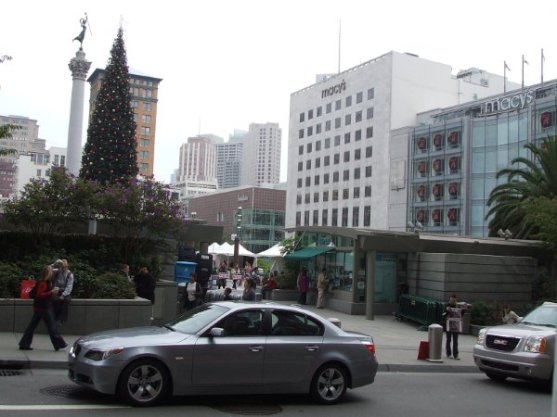 随着缆车我们来到了联合广场(union square), 这里是旧金山的购物中心,这个广场是1850年由当时的市长 Geary 倡导建立献给旧金山人民的。现在四周精品商店,高档酒店,饭店云集,有多次在好莱坞电影中出现过的“圣法兰西斯大酒店”,有第凡内、卡蒂亚、香奈尔和古奇的时装珠宝在此争奇斗艳,代表着旧时的豪华和高贵,而梅西( Macy’s )、妮梦玛珂丝( Neiman Marcus ),还有萨克斯第五大道百货公司 (SAKS Fifth Avenue),盖普(Gap) 等大型百货公司,则体现了现代的时尚,优雅和简约,是我等广大中下农人民的好去处。