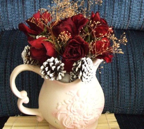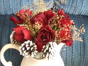红玫瑰花干透后颜色变得很深,我配了几个圣诞节的干松球和满天星提亮,有一些油画的感觉。