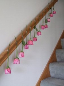 将快要开败的玫瑰除去绝大多数的叶子,每一支倒挂于没有太阳晒到的通风处自然晾干。我是用胶带纸将花枝固定在楼梯扶手上,在开暖气的房间里大约7-8天就干透了。然后稍加修剪就可以插瓶或装饰了……