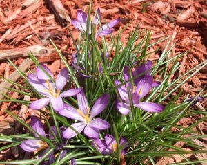 我们家车库门前的这丛迎春花是前房主种的,已经有些年头了,这2,3年来总有老枝枯老死去,不过幼小的新枝也从附近冒出,离老花丛50cm处自己繁殖的一丛新枝已经很有生势了,另人欢欣。紫色的球鳞茎小花每年最早开放,只有3,4英寸高,默默无闻却带来春的信息。