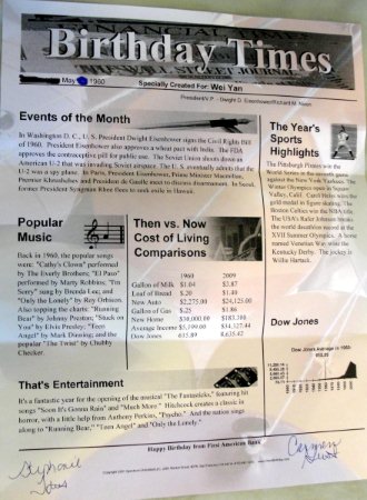 那谁不是说,“人这一生,其实可短暂了,眼睛一闭一睁,一天儿过去了,眼睛一闭不睁,一辈子就过去了! 嚎” 那啥,这个月本小农不是要过生日吗,前2天收到我们开户银行送来的一份贺礼,是一张为寿星特别打造的《生日时报》,虽然只有一个版面,却仍然像正规报纸一样,分为《时事》,《体育》,《音乐》,《股市》,《娱乐》和《生活》6大内容,上面分别记载了寿星出身的当年和当月在美国发生的一些个事情,其中在《生活》版中还比较了当年与今年的几个主要生活指数,挺有趣的,现翻译如下: