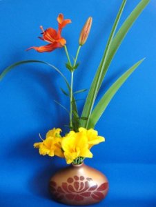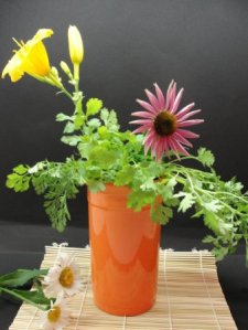 最近心血来潮迷上了插花,用的都是自家院子里的鲜花,绿叶或蔬菜,由于不舍得采的太多,所以美其名为日本式插花—流畅,简约。其实都是“三无三差”作品,三无是无人教,无理论,无意境,三差是摄影差,器皿差,手法差。不过因为是自己的初学作品还是蛮喜欢的,这一组是“夏天系列”,以后可能还会根据院子里的农作物长势和种类,做一些个秋天冬天的。另外,做日式插花很关键的一个工具是“针山”,可以固定花枝摆出任意照型,这个我在这里没有找到,只好用了泡沫花泥(wet foam)来代替。