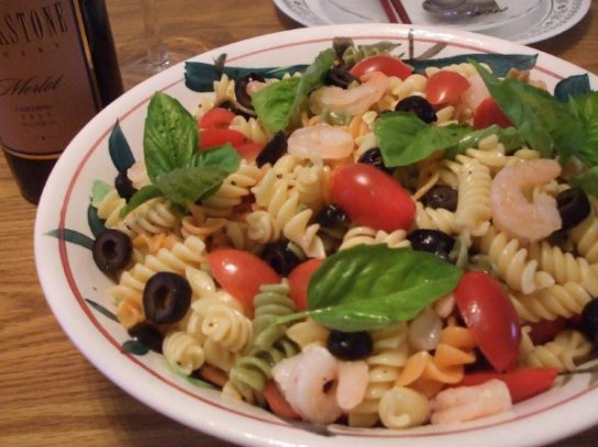 干意大利螺丝面一磅,煮熟晾凉待用,加熟色拉虾,腌橄榄,小西红柿(自种),用橄榄油,意大利醋,盐,糖,黑胡椒,洋葱蓉,蒜蓉根据自己口味调好,加进面里混和均匀,最后撒上几片九层塔(罗勒)叶子(自种的)即可。酸酸甜甜,夏天吃很爽口。
