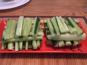 这个没有什么技术含量,就是切条装盘,主要是黄瓜是自己种的(实际上是从朋友家交换来的),超级新鲜爽脆,吃一片羊排,在吃一条黄瓜,非常清口。