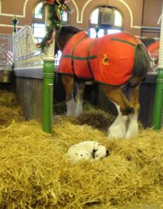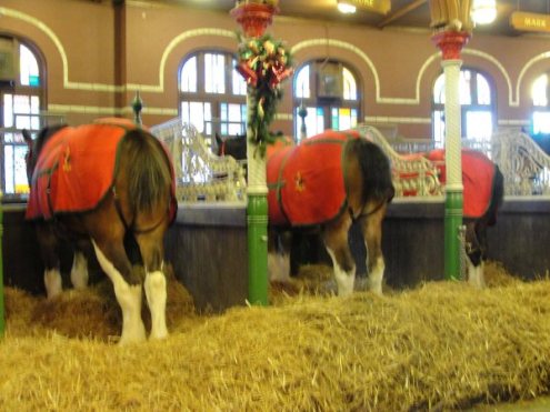 在百威的广告中,一定少不了它们,这种马叫Clydesdales ,来自苏格兰 Clydesdales 地区, 以身高力大, 外形俊美著称. 百威在1933年引进这种马, 用来运送啤酒. 现在仍然养着数十头, 主要用于广告和宣传目的. 这些马每匹都有自己名字,而且颇具大家风范,任凭你游客7嘴8舌,还瞎照相,我就是不给你脸色看。草堆上呼呼大睡的是它们的合作伙伴–大麦町犬(Dalmatia),可以作为马车的前导犬,又可以在货主卸车时看管酒桶,防止偷酒。