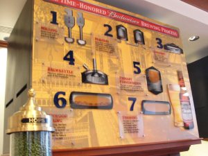 进车间前先介绍生产流程,百威系列啤酒是一种淡啤酒,它是用大米来代替麦类的一种产品,欧洲有些地方对此有争议,不过目前它是美国的主流产品了。