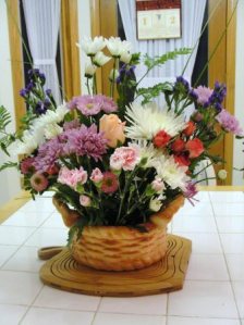 出超市到停车场,恰巧对面车主也开门进车(两车头对头),我开始慢慢倒车出来,忽然感觉自己的车不是倒退而是向前,情急之下,下意识的猛踩刹车,心想,完了,我这个美国老福特怎么和日本疯田车一样自动加速还改变方向啊?几秒钟后才发现,是由于对面的车也在倒退,两车相对运动造成的错觉,还好,虚惊一场。买完菜回到家,楼同学将车道上和人行道上薄薄的雪层打扫干净,迎接晚上将要到来的客人,我开始布置餐厅。前2天已经买了2盆花,感觉气氛还不够,又买了一捧各色鲜花,用夏天邻居院卖时花50美分买的花盆,加上家里剩的花泥动手插了一盆鲜花,象征着新年花开富贵和情人节甜甜蜜蜜: