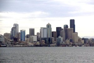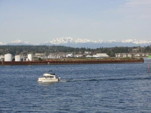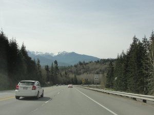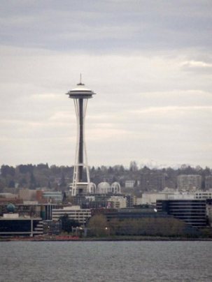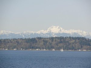 3月19日晚7:30冒雪乘坐美联航班机从Iowa 州府Des Moines 机场起飞,1个半小时到达科罗拉多州丹佛机场转机,飞往西雅图,于当地时间(太平洋时区)11点到达,在机场出租车公司取了预先订好的汽车,几分钟到达就在机场旁边的Ramada Inn 暂住一夜。给楼大学生发了Email 后,洗洗睡了。第二天,是个3月份少有的晴天,开车前往市中心的油轮摆渡口(Ferry), 连人带车渡过Ellott 港湾,到达对岸的小岛—Bainbridge 。油轮每天来往于西雅图和bainbridge 岛,大约50分钟一班。行人和自行车免费,小车11美元/车。油轮底层可放180多辆车,上部是乘客休息室。在轮渡上望南可远眺奥林匹克众山峰,望北看是西雅图城市的建筑群,所以乘轮渡也是西雅图的一项旅游项目。