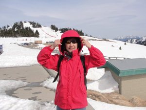到了山顶,才体会到为什么叫飓风岭(Hurrican ridge), 那真是狂风怒号,为了避免拍出俺一头乱发的样子,俺就酱紫了….我身后的山包,夏天是繁花似锦,秋天是金黄色的大草垫子(我看人家拍的照片),冬天则成了一个滑雪场,有一条绳索牵引上山。今天是晴天,所以有很多人滑雪,冒着这样的大风,让俺又佩服了一把。