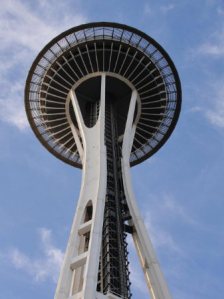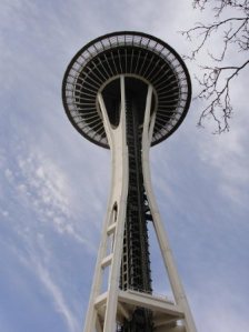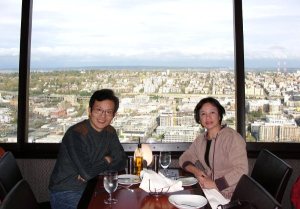 回到西雅图快5点了,天已放晴,我们决定去登太空针塔(space needle)。太空针是1962年西雅图主办世博会而建造的,高600多英尺,现在成为西雅图的地标建筑物。在最上面有观景台,还有360度的旋转餐厅。可以鸟瞰西雅图的全景,是旅游的项目之一。