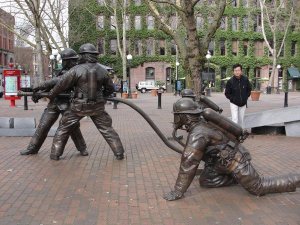 广场上还有一组消防队员的雕塑,是纪念西雅图历史上因公牺牲的消防队员,他们的名字全部刻在碑上,最新的一名是2009年牺牲的。离这组雕塑不远的地方就有西雅图市的第一个救火站。