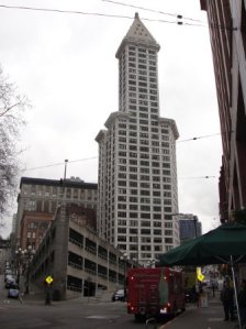 图中的高楼叫斯密斯塔(Smith Tower),1914年建成,是当时密西西比河以西最高的建筑,149米,38层。现在仍然使用,有观光台可居高临下鸟瞰西雅图。它下方三角形的建筑是当年的西雅图旅馆(Hotel Seattle), 现在改造成了3层停车场。在这附近地下有一个“地下城之旅”(underground tour), 由导游带领参观那些在防止海水倒灌,填高地面后低于地面的老街道。我们来得太早没开始(冬春季11点半开始)就没参加。