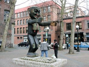 广场上有很多块图文并茂的讲解牌,还有地图,可以按图索骥的找到当时西雅图的第一家银行,第一家饭店,第一家百货公司等等。我想老美这种保护历史,爱护文物的做法是值得我们借鉴的。城市是要发展的,但是文物一但毁了就永远不能重建了。想当年梁思成力劝毛老人家保留老北京古城,在外围建设一个新北京,可惜啊…. 我现在完全理解梁先生看着老北京城墙被推土机推掉时,一个人抱头痛哭的心情….