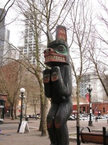 广场上有不少木制的图腾,这些都是原住民印第安人所崇拜的,我想这是白人开拓者对印第安人文化的尊重,也是对占领了印第安人土地的一种愧疚的心情吧。