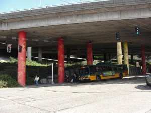 高架桥下的柱子被染成中国红和中国黄,上面画着鲤鱼和蜻蜓,不知有什么典故。