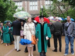 退场后和女朋友合影。会后经济系有一个教职员工招待毕业生和家人的中餐招待会。