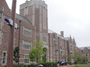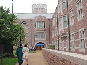 经济系大楼正门。圣路易斯华盛顿大学已经有157年历史了,学校建筑风格为哥特式。经济系大楼是近2年新建的,也沿历史风格建造,与校园整体建筑协调。这座大楼由校友Harny and Susan Seigle 夫妇捐款2000万美元加其他款项建成的。美国大学里这样的校友捐款十分常见,也是一种传统,特别是在私立大学。当年学子们得到了学校(也是学长们捐款设的奖学金)给的丰厚各种奖学金和助学金,心存感激,多年后,当他们有了能力,往往就会回报母校,如此良性循环,学校就得以发展和有能力帮助更多的学生。