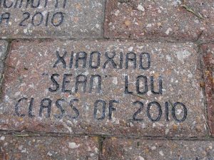 为了纪念楼大学生在校园内度过的4年美好时光,我们捐给学校500美元,给楼大学生刻制了这样一块砖。其实主要是再一次的感谢学校给与楼大学生每年26450元的奖学金。以后就看楼大学生是否有大出息给学校回报了。