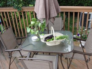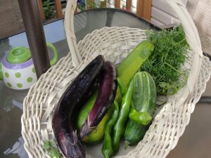 坐在露台的椅子上喝着小茶,看着丰收的成果,还是很有幸福感的哦。我大学同学夫妇来我们玉米地探望留学的儿子,我也赠送了自产超级新鲜的黄瓜3根,绿花菜2头,辣椒若干,大家分享一下农家乐。