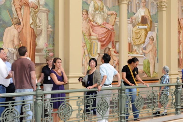美国有50个州,每个州的州府所在城市都有一个州府大楼,叫state capitol building , 相当国内省会城市里的省政府大楼,里面有州政府的各路大员在此上班。与国内的省府大楼所不同的是,美国的州府大楼没有高墙深院,戒备深严的门警,它是完全开放给公众参观的,所以每一个游客可以在周一到周六的规定时间来州府大楼”串门子“,而且有义工提供的免费导游,除了来此观光旅游,也是老百姓,中小学生了解美国各州历史,学习政府运作的好场所,体现了取之于民(纳税人),用之于民(纳税人),服务于民的政府宗旨。只是9/11后加强了保安,游客一律从通往地下室进入,通过类似飞机场那样的安检程序方可进入大厅。