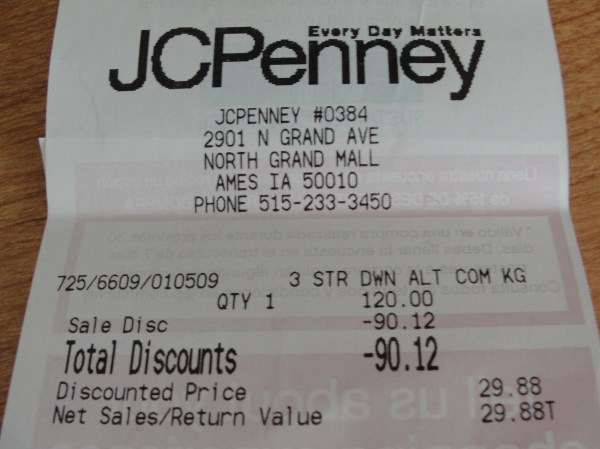 出了walmart, 到附近的mall 里的JC Penny 转了一下,本来也没想买什么,后来看到一款运动服又降价了,上个月我买了一套,从原价30元/件降到了12.99元,冬天在家做运动穿很舒服,今天又降到9.98元/件,又买了一套2件不到20元。更大的惊喜在床上用品部,仿羽绒被,King size, 原价120美元,黑色周五无论任何尺寸,通通29.88元/条,正好下个月圣诞节除了儿子和他女友,还有小两口要来我家过节,所以需要一条新被子,赶紧拿下一条,还有,这天下午3:00到晚上关门,买满50元的东西,店家还给10元减价卷,为了凑够50元,又买了一双毛茸茸的手套,原价12元,现价3元多,所以最后俺付的价钱是….看图吧: