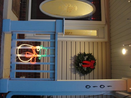 今年动手有点晚了,过了感恩节才全部完成的,虽然那时还没下雪,但气温已经接近零度,风也很大,在这样的室外上蹿下跳真不是好玩的,所以布置得比较简单,杯具的是原来插在小鹿外围一圈的小棍灯,过了几天突然不亮了,算了,地都上冻了,懒得换了,就这样吧。