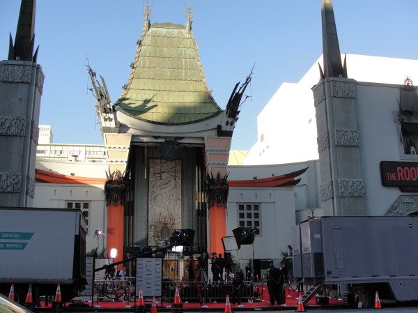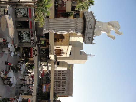 好莱坞的又一著名地标—中国剧院(Grauman’s Chinese Theater),1927年建造,具有浓厚中国味的电影院,1944-1946年间的奥斯卡奖在此颁发。现在是好莱坞大片首映式的电影院。巧的是,我们去的那天晚上正是电影《金刚 3D》的首映式,所以门前都是各大媒体的采访车,并实施了管制,不让游人进去参观。中国剧院有名之处还在于它的门前有最有影响力的明星们的手印和明星们的签名,那天因首映式的管制也没看成。