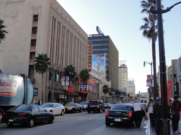 已经有100年历史,并不宽大的好莱坞大道。远处白色的大楼是Roosevelt 旅馆,1929年第一次奥斯卡金像奖就是在那里颁发的。