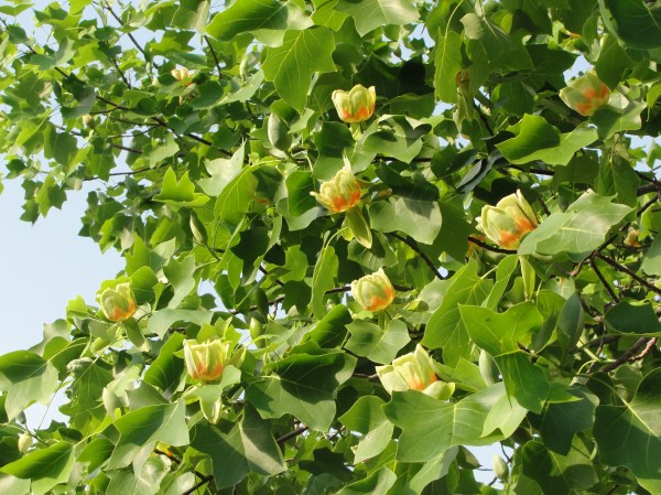 长在树上的郁金香花,中文名称–鹅掌楸,英文名称就叫郁金香树(tulip tree)