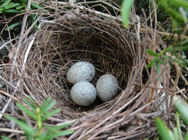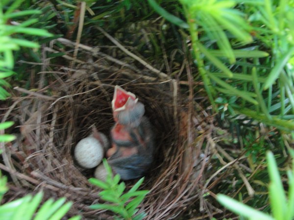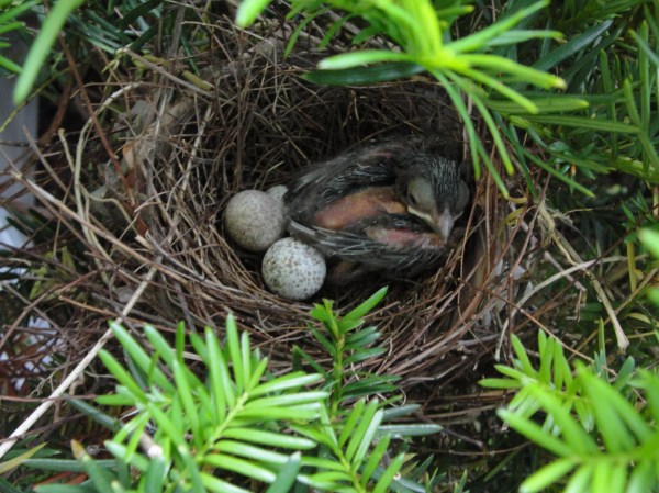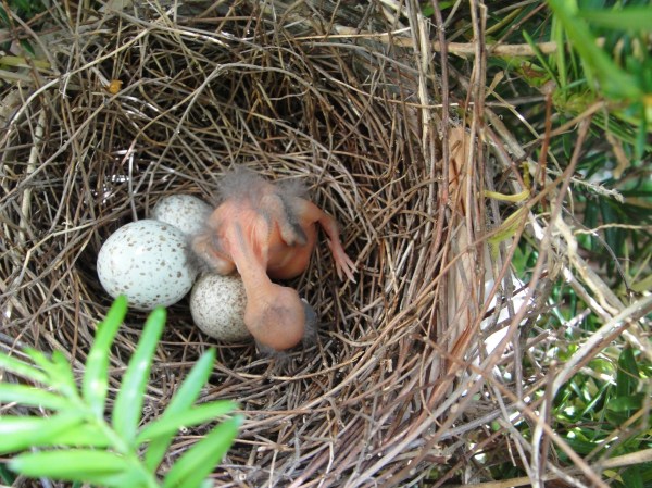 一个月前在我的博文《母亲节的鲜花与其他》中介绍了我家前院西窗前的鸟窝和鸟蛋,后来又观察了一次,发现是有4只蛋在窝里。如今过了一个月,终于,第一只小鸟出壳了!