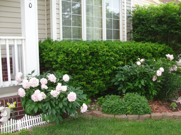一个月后,冬青篱笆越长越茂密了,芍药花也开了