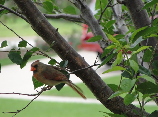 也许是鸟爸鸟妈与我们熟悉了,知道我们没有恶意,他们在我们查看鸟窝时,不像以前那样飞得远远的,就在前面的小树上吱吱的叫,终于拍到一张较为清楚的,这次可以确定是红雀鸟了(cardinls)