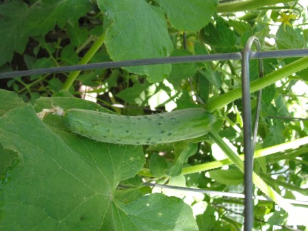 黄瓜有2个品种,共7株。这个是细长型的,还有矮胖型的,不用搭架子的,就在地上爬的。现在已收了大小胖瘦的黄瓜10多根了,每天基本一盘拍黄瓜,爽脆可口。