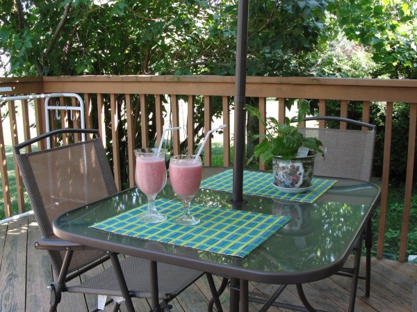 今天我们这里华氏98度,摄氏大约34度,是入夏以来最热的一天。早上乘温度还不是最高,给花园菜园浇了水,又移栽了前几天买的2盆花到地里,出了一身汗,也算是排毒了。好在室内全空调,室内室外完全两个世界,洗了澡,吃了午饭,看了台湾8卦新闻,决定做点清凉饮品当下午茶犒劳一下自己。天热,就做个草莓smoothie 吧。