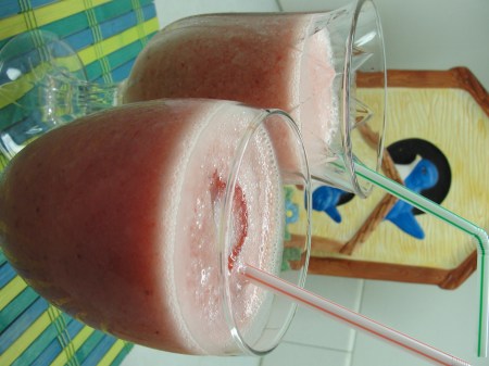 草莓是前几天超市买的,大包装,4磅只要4.99元,1/3 新鲜时吃了,2/3 放冰箱冷冻,作smoothie 最为方便,加上果汁和酸奶都是冷藏的,所以在搅拌时不用加冰块了。
