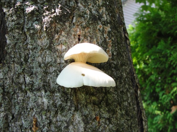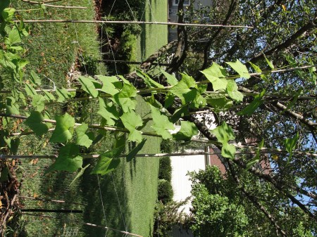 2株西葫芦中间的丝瓜在西葫芦拔掉之后,沐浴了更多的阳光,被成功引导向树上发展,丝瓜很晚熟,现在还没开花迹象。