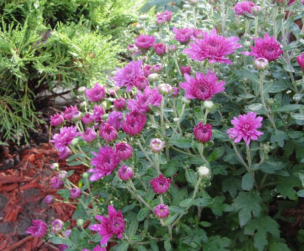 米国的菊花没有国内的千姿百态,多数属于可以种在室外并可以过冬的”Gargen Mum” , 庭院菊,一枝小小的苗,到来年的秋天便发出几十倍的一大丛,花头虽然小,但以数量大去胜,全部绽放的时候还是很壮观的。