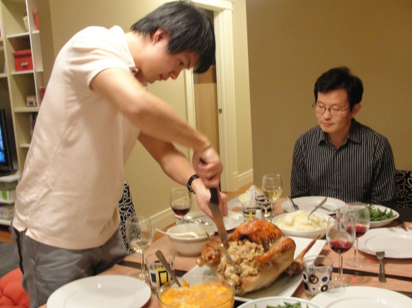 按传统风俗,由男主人切火鸡分给客人,这次小楼同学是主人,老楼同学第一次坐享其成,心中得意无比啊。