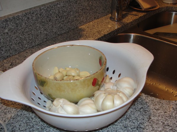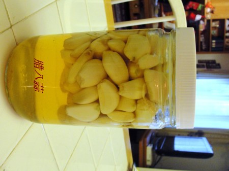 晚上应邀到一个朋友家开Party,他们家在去年买了新房子,又添了一个宝贝女儿,也是双喜临门。我们带了一个阎家食堂保留菜目—洋葱爆炒牛仔骨,每次都得到好评。今年腊八节,头一次炮制了腊八蒜。前段时间在Sam’s Club 买了大包装的大蒜头,大概有5磅多,才3美刀,质量很好,比超市1美元买3头的合算多了,不过时间长了,大蒜会干瘪空掉或发芽。这次正好制作腊八蒜有用武之地了: