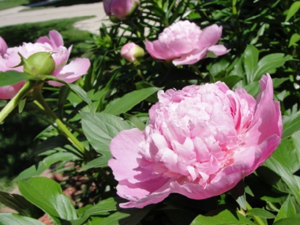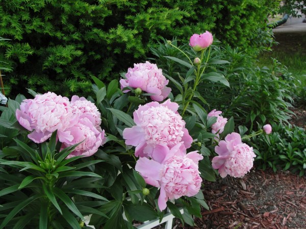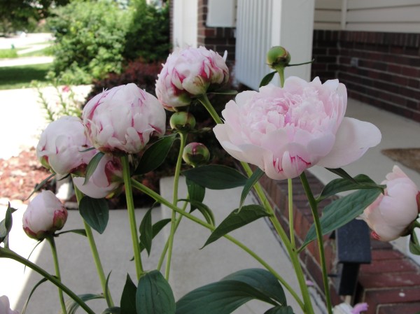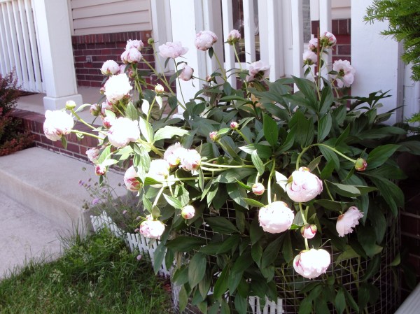 五月是芍药花盛开的季节,前院有4丛芍药花,一丛是深粉红的,三丛浅粉红,都是前房主种的。每年冬天前齐根剪去残枝,第二年春天就会如雨后春笋般冒出很多头来。然后长势及快,每枝上都能顶上不只一个的花苞,我家的这种品种花开得比碗口大,所以当花苞出现时就要用架子撑住,否则会全部扑地: