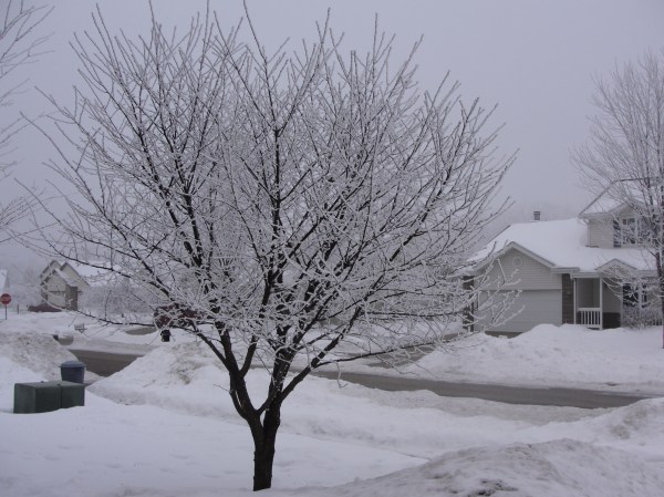 2010年1月9日,一场暴风雪过后,屹立在冰雪中的樱桃树。(站在门前照的,对面是邻居)